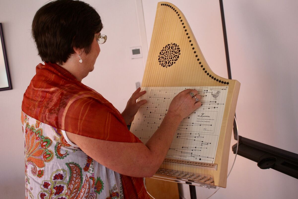 Projektleiterin Tanja Schleyerbach stimmt das Märchenlied »Der Zaunkönig« auf der Veeh-Harfe an. FOTOS: SPIESS