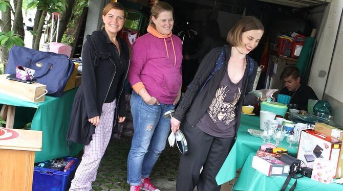 Aus der Garage heraus: Die Idee stammt von Patricia Vallat (Bildmitte). Bei der zweiten Auflage zum Garagenflohmarkt in der Römerschanze wurde sie von Tina Otromke (links daneben) tatkräftig unterstützt. Kundin Sonja Storath aus Tübingen findet die Idee »einfach super«.