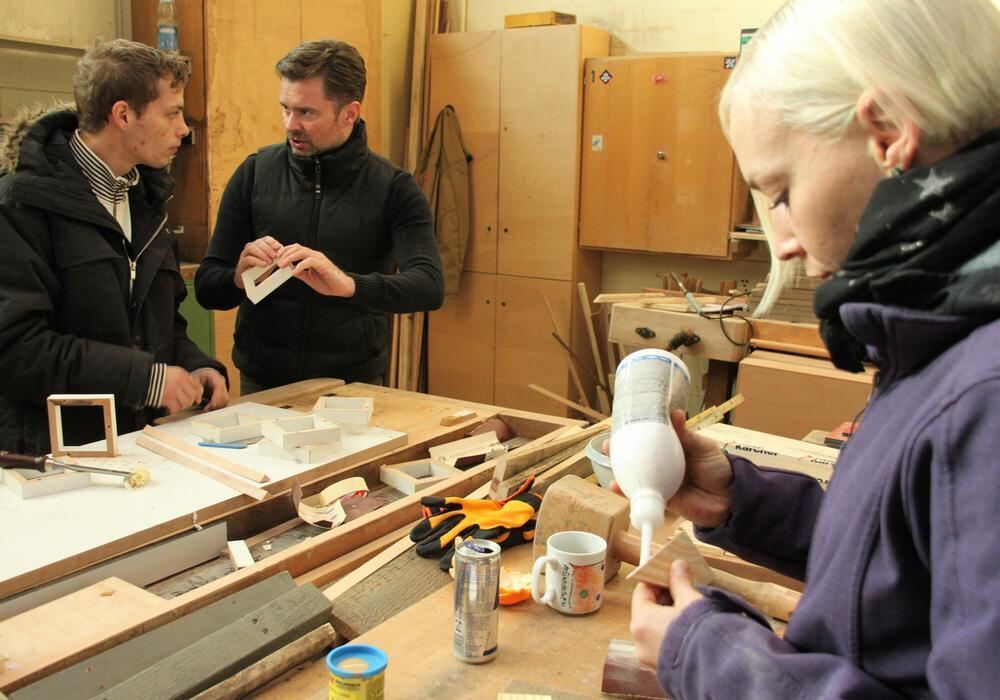 Meister Patrick Schubert (Mitte) steht Marcel Grieb und Sarah-Rebecca Duvaux an der Werkbank zur Seite.