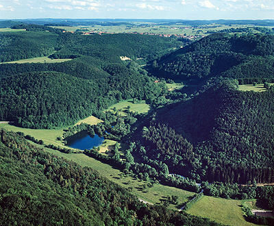 Das obere Wiesaztal bei Gönningen mit den Seen. Die von diesen diagonal nach rechts unten verlaufende Baum-/Sträucherreihe markiert den Verlauf des Baches. Nur jenseits davon soll der Talgrund nach dem Willen der Gönninger Räte als Vogelschutzgebiet ausgewiesen werden.