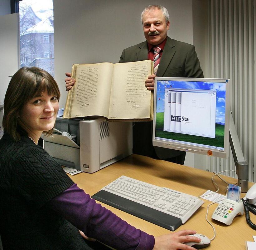 Standesamtswesen heute: Künftig werden Geburten, Eheschließungen und Sterbefälle am Computer erfasst und zentral gespeichert - sicher für mindestens hundert Jahre und geschützt vor unbefugten Neugierigen, versichert Bürgeramtsleiter Hans Raach, links mit Urkundsbuch von anno dazumal und Mitarbeiterin Elke Rist am Computer mit neuem Programm. GEA-FOTO: HD