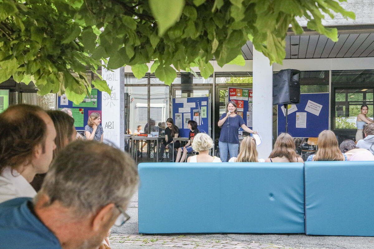 Projektleiterin Vera Kaphegyi eröffnet den Markt der Möglichkeiten auf dem Schulhof der Laura-Schradin-Schule.