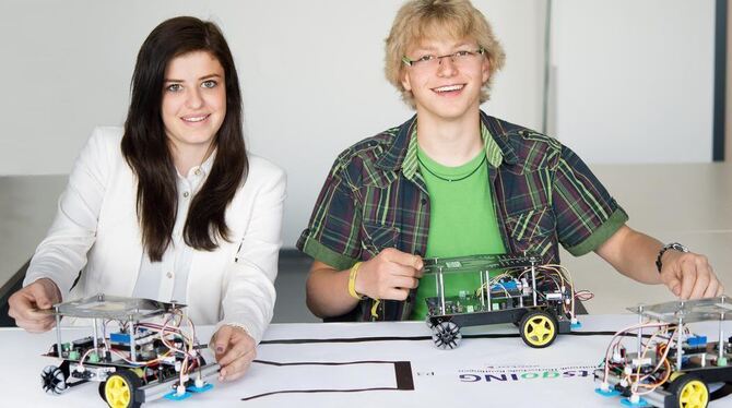 Gianna Kauck und Manuel Eppler vom Isolde-Kurz-Gym-nasium mit drei Vehikeln, die sie im Unterricht gebaut haben.