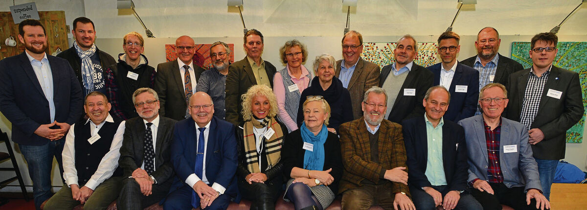 Prominente Mitarbeiter machen Mittagspause in der Nikolaikirche (oben von links): Mark Böhringer von der Bruderhaus-Diakonie, Zwiefaltens Bürgermeister Matthias Henne, Werkstattbeschäftigter Christian Rodemeister, Vorstandsvorsitzender Lothar Bauer, die Kreis- und Stadträte Eberhard Günter, Jürgen Fuchs, Gertrud Kleineickenscheidt, Gabriele Janz, Thomas Keck, die Bruderhaus-Vorstandsmitglieder Günter Braun und Andreas Link, Grabenstettens Bürgermeister Roland Deh, Römersteins Bürgermeister Matthias Winter; untere Reihe von links: Walter Rebstock, Finanzbürgermeister Alexander Kreher, GEA-Verleger und Schirmherr Valdo Lehari jr., Stadträtin Karin Villforth, Kreisrätin Barbara Dürr, Stiftungsratsvorsitzender Martin Beck, Sonnenbühls Bürgermeister Uwe Morgenstern und Stadtrat Helmut Treutlein.