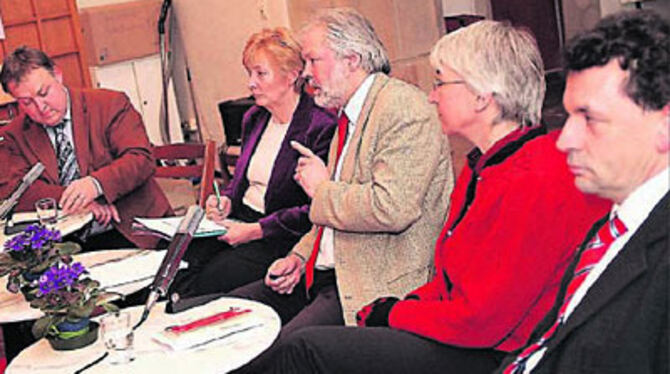 »Kein frohes Thema«: Armutsdiskussion in der Vesperkirche mit Moderator Jens Junginger (links), Bundesminister a.D. Ingrid Bergmann, Diakonie-Geschäftsführer Günter Klinger, Cornelia Karl vom Sozialamt und Ulrich Bausch, Chef der Volkshochschule.