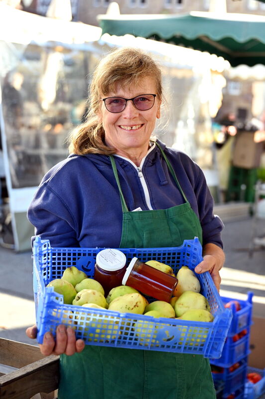 Herbstliche Köstlichkeiten mit inneren Werten: Quitten haben jetzt Saison. Am Stand von Monika Warwel gibt es sie pflückfrisch aus Neuhäuser Anbau.