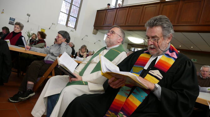 Vesperkirchenpfarrer Jörg Mutschler (rechts) neben Thomas Hörnig, die einstmals Nachbarn in Reutlingen waren. FOTO: LEISTER