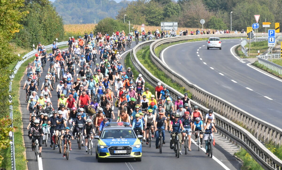 Der Tross der 5.000 Radfahrer, angeführt von einem Polizei-Auto.