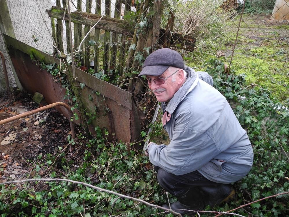 Dieter Veit in seinem Mittelstädter Garten mit dem V1-Tragflügel, der als Rückwand des Hühnerstalls diente.