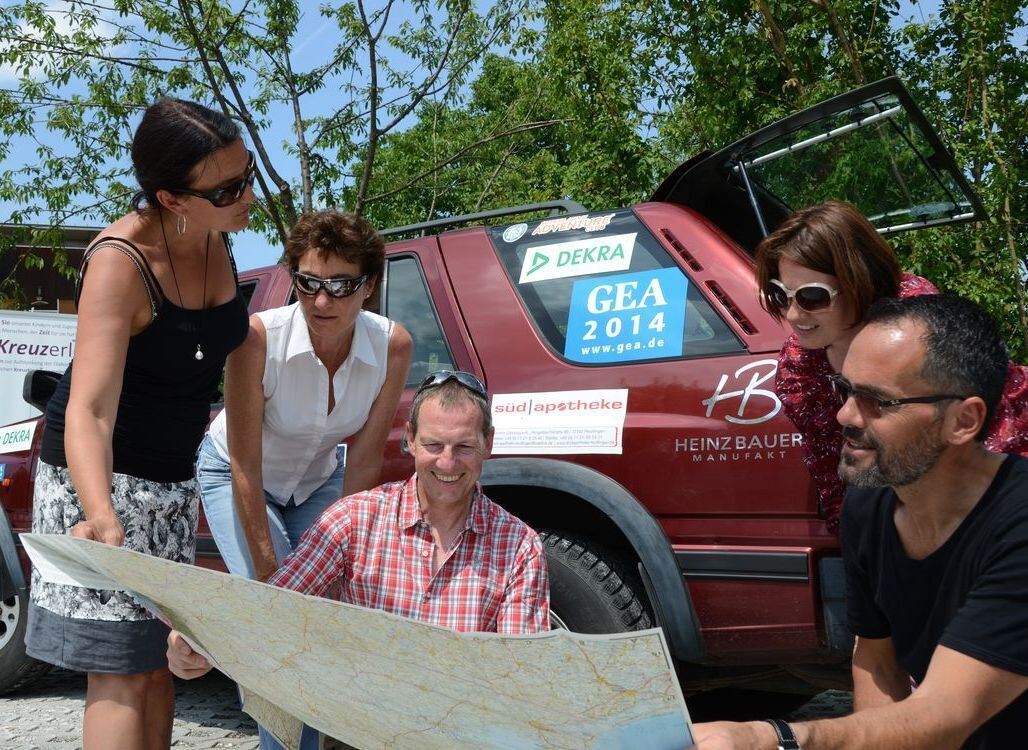 Auf dieser Rallye zählt die gute alte Karte: Navigationsgeräte sind bei der Baltic Sea Circle verboten. Gestern bei der Verabschiedung (von links): Karin Stoll, Anette Nagel, Rallyeteilnehmer Bernd Nagel, Gisela Hamal und Rallyeteilnehmer Stephan Sigloch.