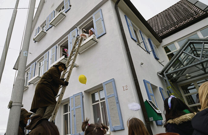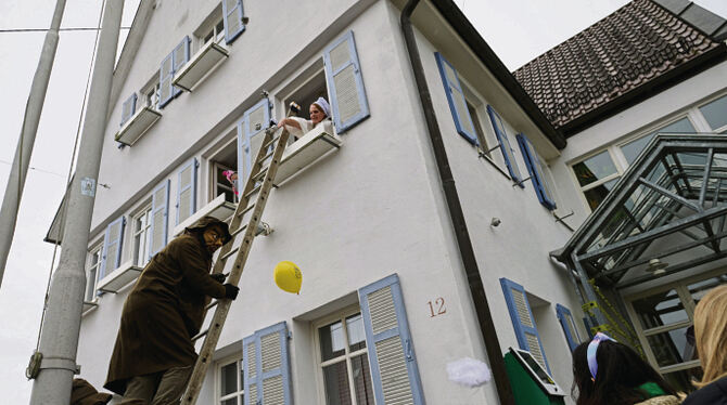 Der mit Luftballons und Bändern versperrte Zugang zur Amtsstube von Ohmenhausens Bezirksbürgermeisterin Andrea Fähnle, konnte die Bande des Räuberhauptmanns Hannikel und die Mahdichweible nicht aufhalten. Mit einer Leiter kletterten die Halunken und Spukgestalten an der Fassade bis in den zweiten Stock und übers Fenster in den Verwaltungssitz. Die Ortsvorsteherin und ihre Verwaltungsangestellten sowie Werner Koch, Manfred Salzbrunn und Martin Ankele vom Ortschaftsrat stellten sich den Eindringlingen mutig in den Weg. Doch am Ende half alles nichts: Andrea Fähnle gab den Schlüssel ab und musste machtlos zusehen, wie die Narren Schubladen öffneten, Anrufe von perplexen Bürgern entgegennahmen und ihren eigenen Haushaltsplan an die Rathaustür schlugen. Begeisterte Kinder der Waldschule Ohmenhausen und ein paar Bürger tanzten Polonaise im Sitzungssaal, bevor der närrische Trubel bei der Kinderfasnet und später der Hallenfasnet in der Dorfschule weiterging. Die Amtsgeschäfte, versicherte Andrea Fähnle hinter vorgehaltener Hand, werden in den kommenden Tagen trotz der Machtübernahme wieder wie gewohnt fortgeführt.