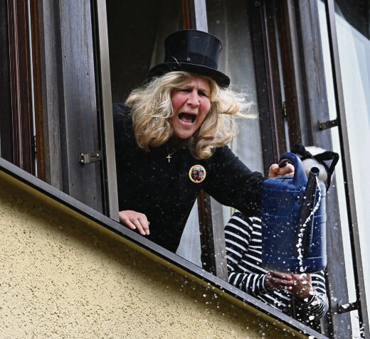 Auch in Bronnweiler erwies sich der Widerstand von Dorfchefin Friedel Kehrer-Schreiber und ihren Getreuen als zwecklos: Dort übernahmen die Krum-Hexen am Vormittag das närrische Regiment, nachdem sie zuvor ihre Narrenfahnen gehisst hatten. (GEA)
