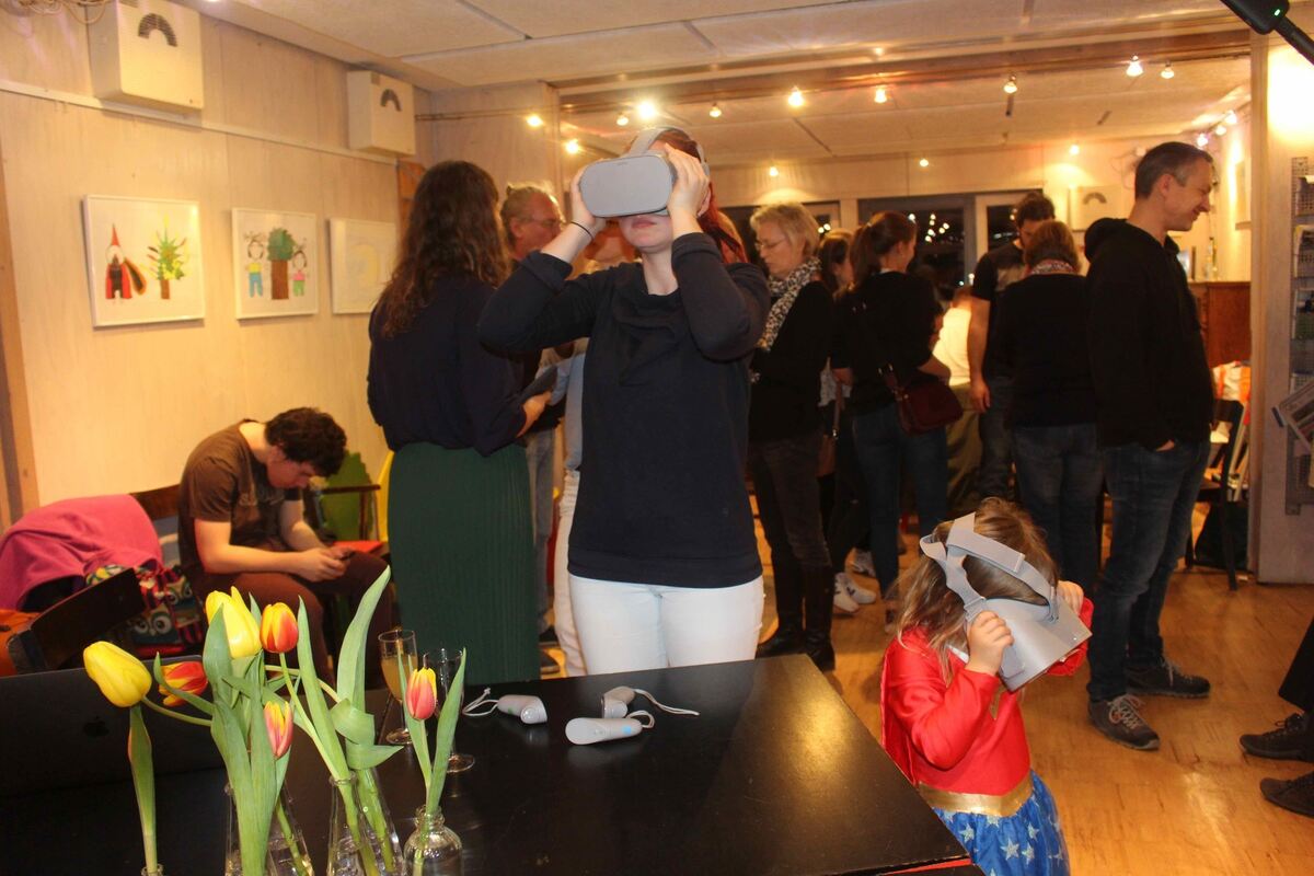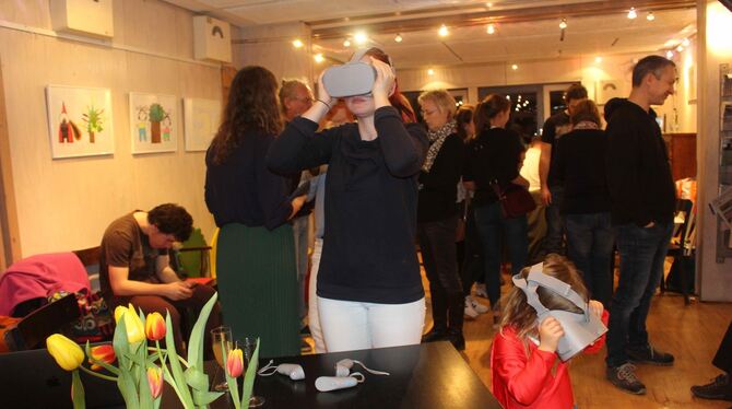 Die Besucher des Kaffehäusles betrachteten das Video mit VR-Brillen oder auf Monitoren. FOTO: SPIESS