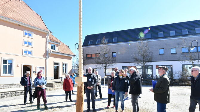 Kunst im öffentlichen Raum: Bewertungskommission, Ortschaftsräte und Bürger interpretieren eine von Christian Fink aus dem Stamm des Gemeindeweihnachtsbaums geschaffene Holzskulptur. Für Schultes Altmann symbolisiert sie eine »Stellschraube der Zukunft«.