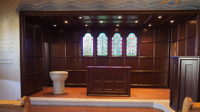 Der Altarraum der Reichenecker Dorfkirche ist nach Monaten aufwendiger Reparatur- und Restaurierungsmaßnahmen wieder möbliert und erstrahlt in neuem Glanze. Foto: Geisel