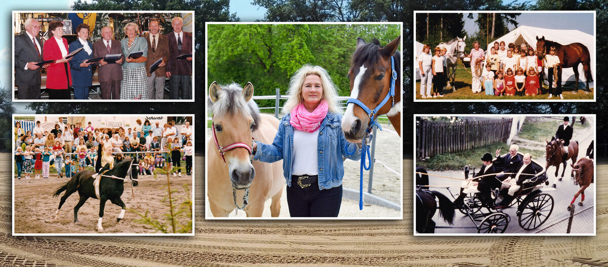 Claudia König, Vorsitzende der Sondelfinger Reiterkameradschaft, wird von den Schulpferden Lady und Bianca eingerahmt – und von Bildern aus der Vereinshistorie: Ehrung von Gründungsmitgliedern bei der 25-Jahr-Feier 1994 (oben links), Zeltlager (oben rechts) und Voltigiervorführung (unten links) Ende der 1980er-Jahre; unten rechts wird der huldvoll grüßende OB Oskar Kalbfell zusammen mit dem damaligen RKS-Vorsitzenden Kurt Reinhardt 1969 zur Einweihung des Reitplatzes kutschiert. FOTOMONTAGE: SCHÄLE-SCHMITT