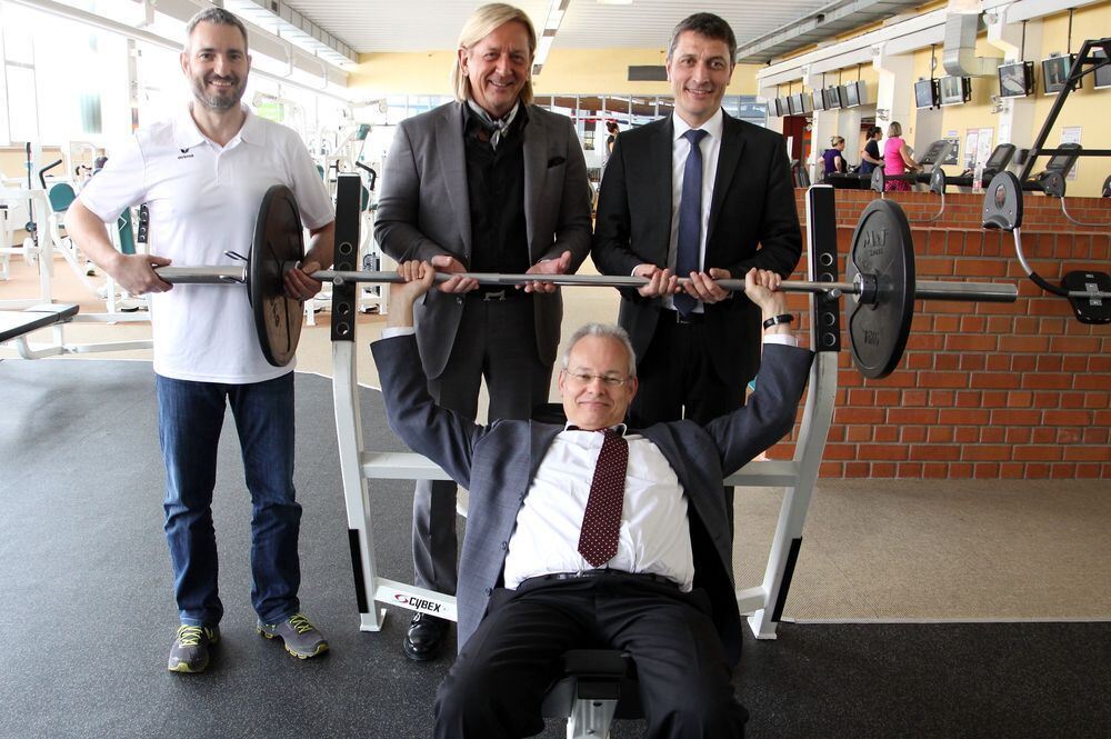 Mit vereinten Kräften wird die zweite Gesundheitsmesse in der Stadthalle gestemmt: Dr. Christoph-Michael Pfefferle (liegend) wird von (von links) Angelo Bauso, Eckhard Zieker und Peter Kolb tatkräftig unterstützt. FOTO: KOZJEK