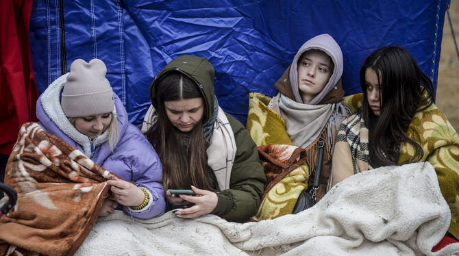 Flüchtlinge, die vor dem Krieg aus der Ukraine geflohen sind, warten an der rumänisch-ukrainischen Grenze. FOTO: DOBRE/AP/DPA
