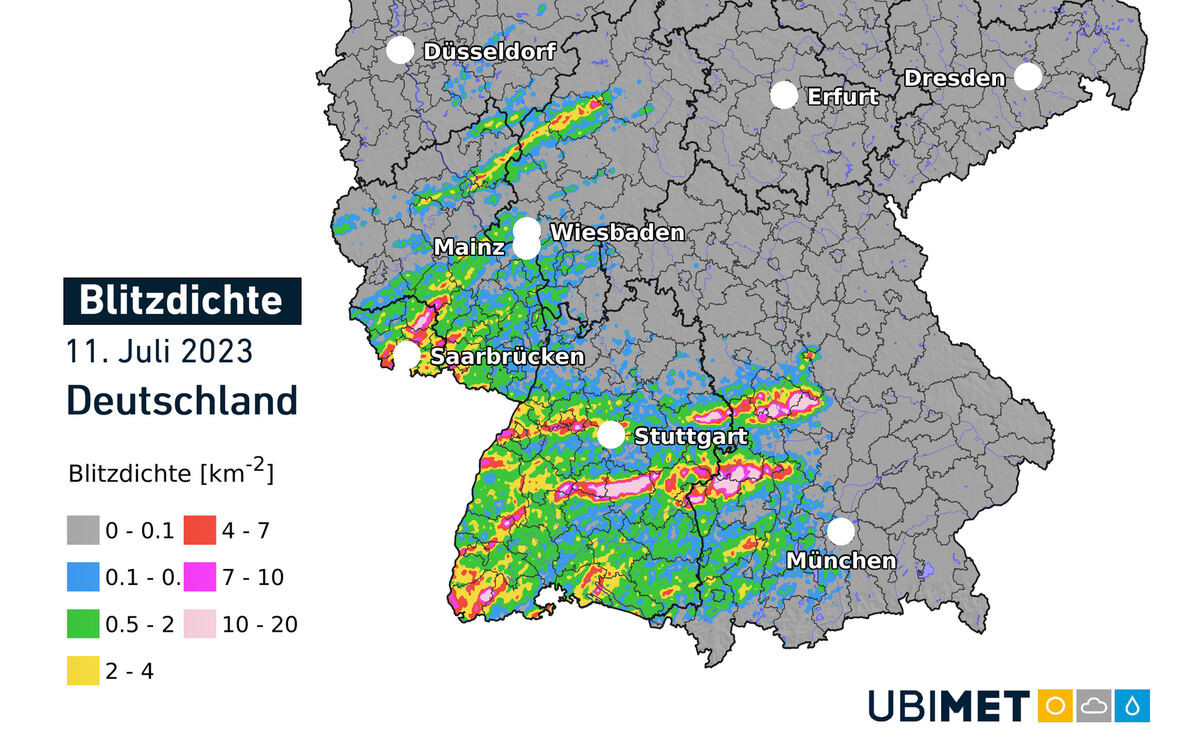 Wie das Münchner Blitzortungsunternehmen Nowcast auf GEA-Anfrage mitteilt, war Reutlingen am 11. Juli blitzreichster Landkreis Deutschlands. 6.096-mal leuchtete der Himmel in der Region auf, im zweitplatzierten Kreis Weißenburg-Gunzenhausen waren es »nur« 4.992-mal. Der stärkste Blitz in Reutlingen hatte eine Stromstärke von 125 Kiloampere. »Das ist zwar ganz ordentlich, aber kein Rekord«, sagt Meteorologe Nikolas Zimmermann. Auffallend sei jedoch die Blitzdichte, die stellenweise bis zu 20 pro Quadratkilometer betrug. »Das hat man selten, diese Gewitter waren recht blitzreich«, so Zimmermann.