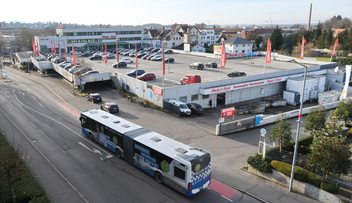 Blick vom gegenüber liegenden Parkhaus runter auf das Parkdeck und Gebäude des Media Markts. In einigen Jahren soll hier ein neues Stadtquartier entstehen.
