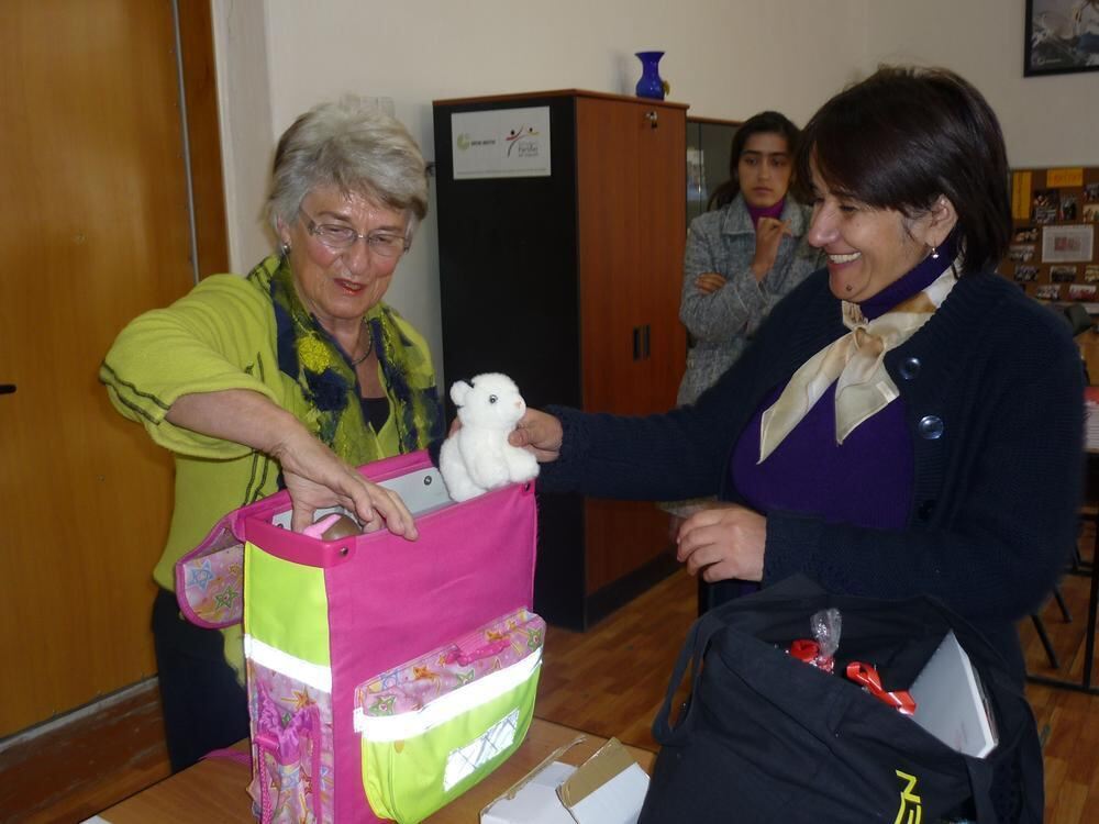 Hilfe, die im doppelten Wortsinne ankommt: Suse Gnant überbrachte tadschikischen Kindern Schulranzen und Spendengelder für Schulspeisung und Winterkleider. Sie wurde begeistert empfangen. FOTO: PR