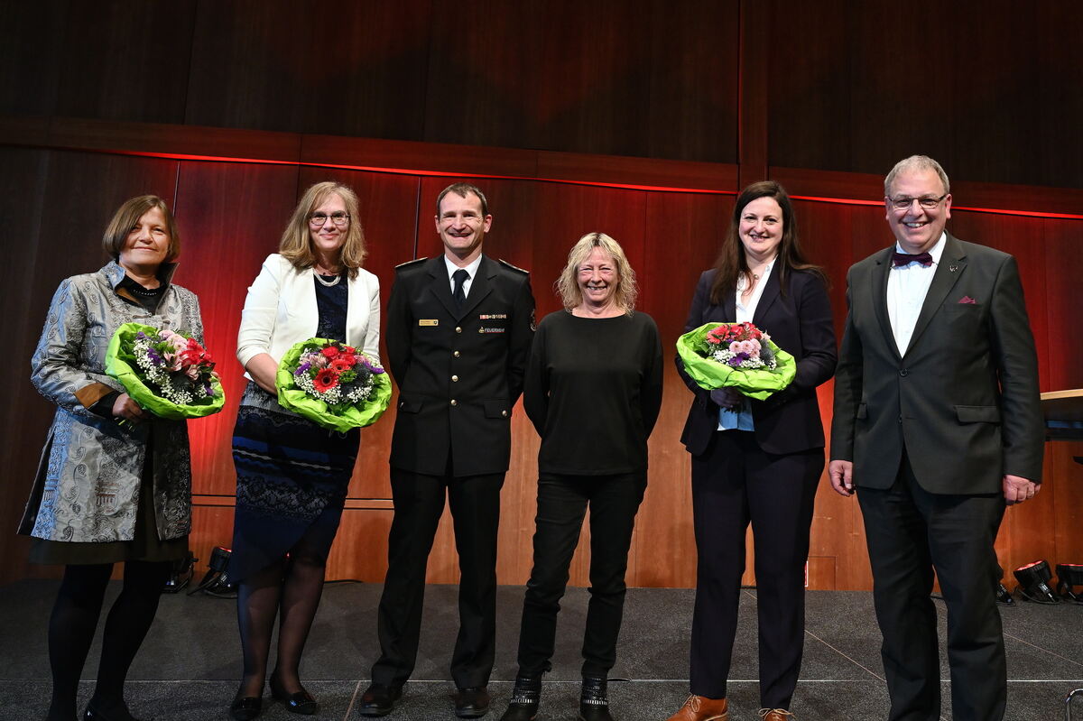 Blumensträuße und blumige Worte: Sabine Külschbach (von links), Anke Bächtiger, Michael Reitter, die stellvertretende Personalratsvorsitzende Martina Raiser, Kathrin Berger und Oberbürgermeister Thomas Keck bei der Amtseinsetzung.