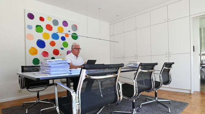 Architekt Wolfgang Riehle macht einen großen Tisch in seinem Haus vor einem Gemälde von Jerry Zeniuk zum luftigen Homeoffice. Er arbeitet dort mit einem iPad.
