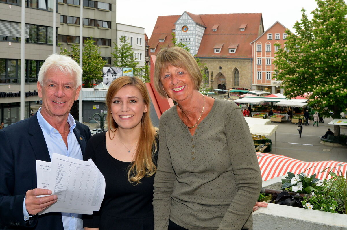 Die Architekturstudentin Neslihan Akyildiz (Mitte) hat mit Unterstützung der WiR-Gemeinderatsfraktion eine Umfrage zu Reutlingens Zukunft erarbeitet. Fürs GEA-Foto posiert sie mit den WiR-Räten Professor Dr. Jürgen Straub und Ute Beckmann auf dem Rathaus-Balkon. FOTO: NIETHAMMER