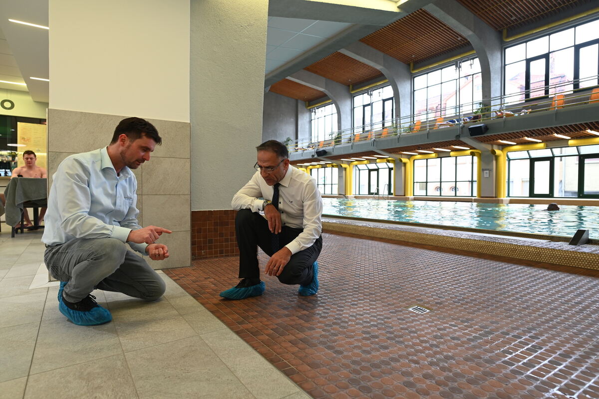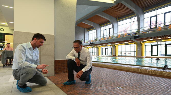Wo im Achalmbad das Problem beginnt: Betriebsleiter Mario Werner (links) und Bäderchef Necdet Mantar hocken an der Grenze zwischen dem bereits neu gemachten Kleinkinderbereich und den alten braunen Fliesen, deren Unterboden durchnässt ist. FOTOS: ZENKE