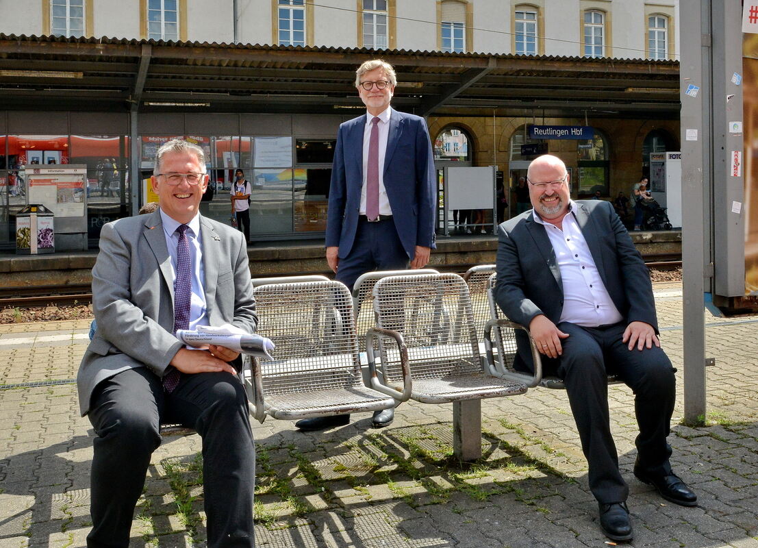 Die alten Drahtgitterbänke werden ersetzt, Reutlingens CDU-MdB Michael Donth, Bürgermeister Alexander Kreher sowie Friedemann Keßler, Leiter Vertrieb Mobility DB Station & Service AG (von links), freuen sich schon auf die neuen. FOTO: NIETHAMMER