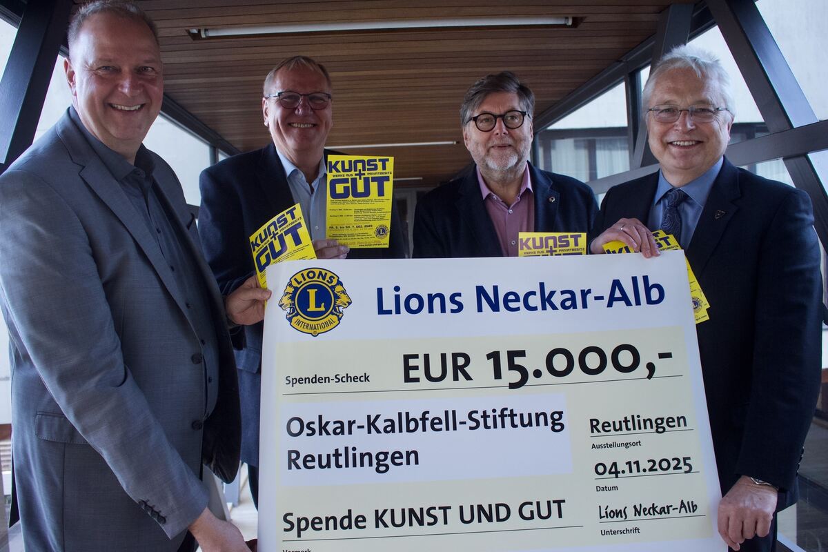 Kurt Meyer, Leiter des Amts für Schulen, Jugend und Sport, Eckhard Raisch, Vorsitzender des Lions Clubs Neckar-Alb, Galerist Wilfried Thron und Kulturbürgermeister Robert Hahn (von links) freuen sich über einen Rekorderlös.