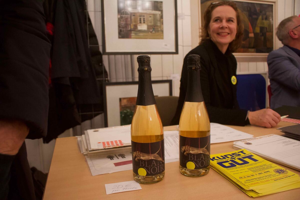 Eine weitere Aktion rief der Lions-Club eigens zu seinem 25-jährigen Jubiläum ins Leben, indem er den vom Dettinger Weingut Bächner erstandenen Bio-Sekt »Méthode Champenoise« bei der Vernissage zum Verkauf anbot. Von dem edlen »Blanc de Noir«-Tropfen wurden insgesamt drei Kisten verkauft und der Reutlinger Verein Wirbelwind für jede verkaufte Flasche mit 6,50 Euro unterstützt. (GEA)