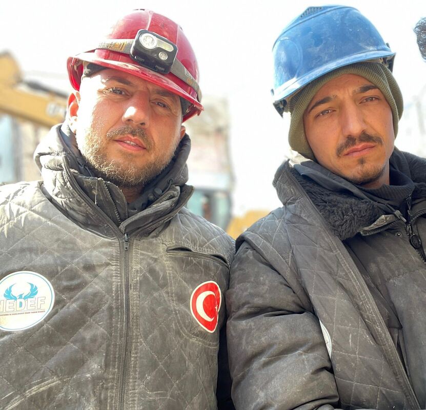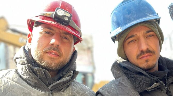 Kadir Uysal (links) und Onur Durmus sind direkt nach dem Erdbeben ins Katastrophengebiet gereist, um zu helfen. Die Aufnahme zeigt sie bei ihrem Einsatz in Hatay.