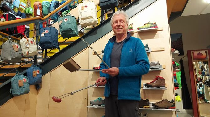 Volker Heck, Inhaber des Canadian Husky in der Wilhelmstraße in Reutlingen, präsentiert seinen Wandergrillstab. FOTO: CONZELMANN