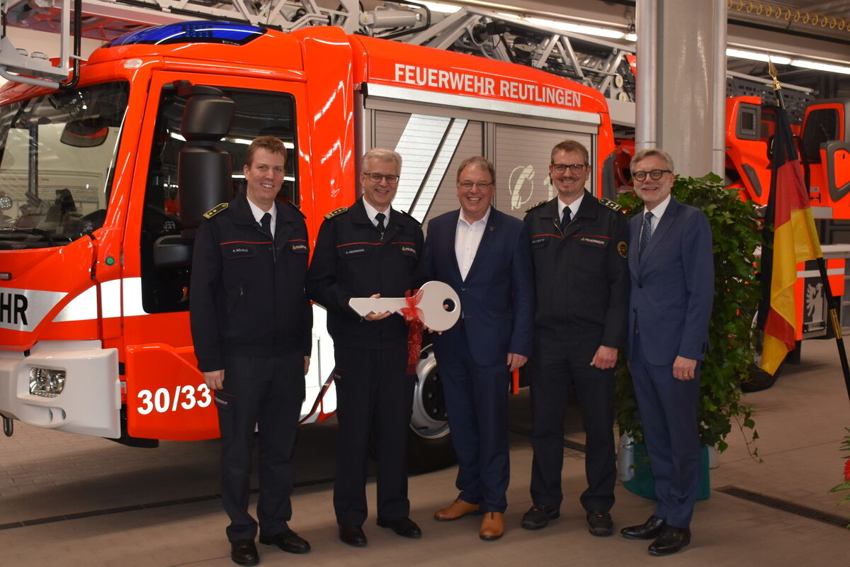 Strahlende Gesichter bei der Schlüsselübergabe für die neue Drehleiter (von links): stellvertretender Kommandant Adrian Röhrle, Stadtbranddirektor Harald Herrmann, OB Thomas Keck, Technik-Chef Martin Reicherter und Finanzbürgermeister Alexander Kreher.