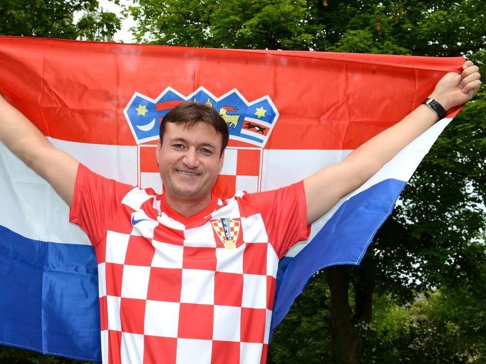 Ab nach Brasilien – natürlich von Kopf bis Fuß im WM-Outfit: Kroatien-Fan Josip Vukoja reist nur fürs Eröffnungsspiel nach São Paulo.