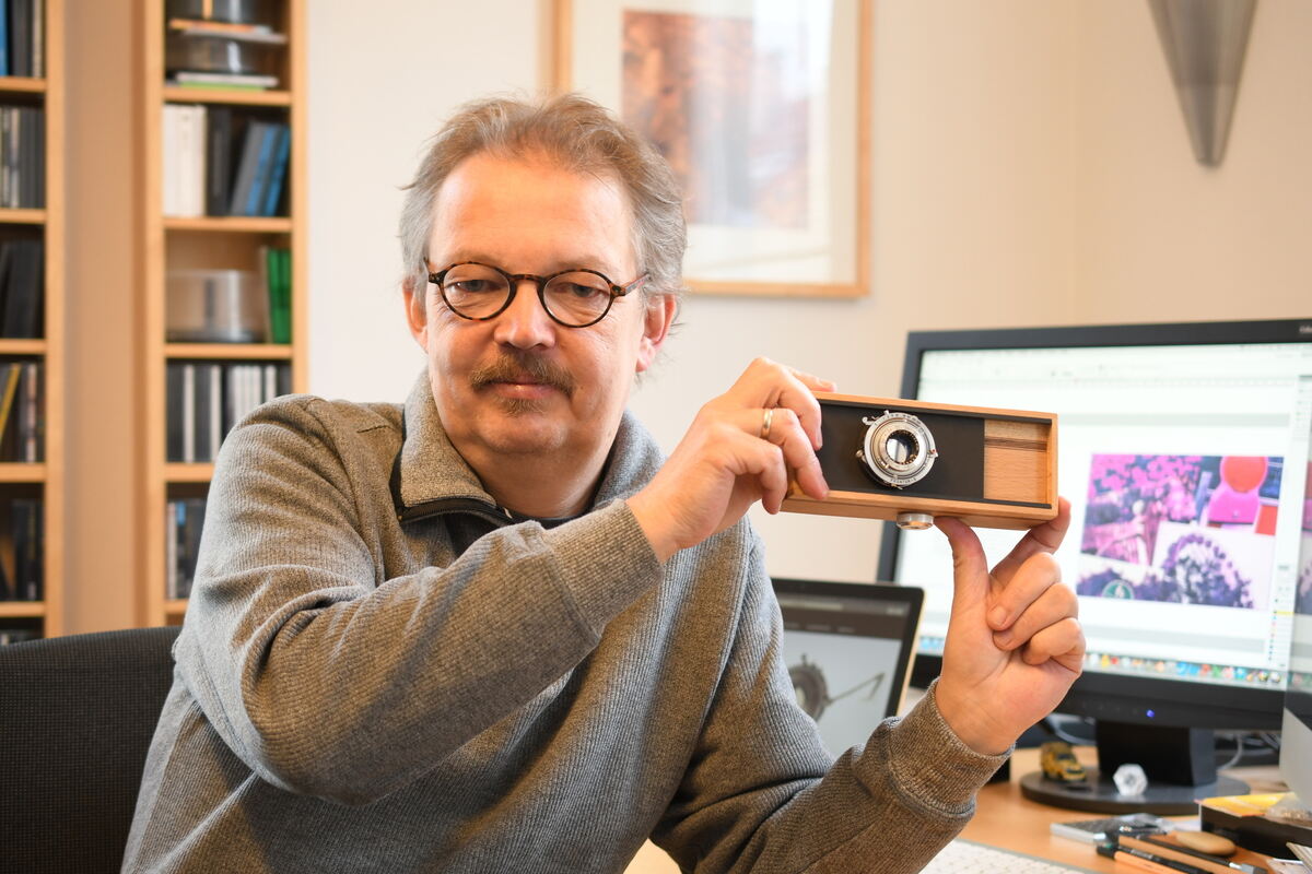 Der Reutlinger Autor Cyrill Harnischmacher zeigt eine Panoramabox-Kamera. Leser seines neuen Buches »Heimwerken in der Fotografie« können sich einen solchen Zauberkasten nach seiner Anleitung selbst basteln.