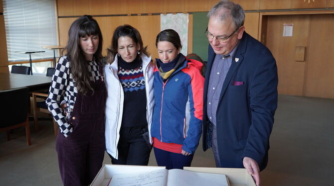 Um die Reutlinger Wurzeln der Familie kennenzulernen, waren eine Nichte und zwei Großnichten Hannelore Maiers in der Achalm-Stadt. Oberbürgermeister Thomas Keck hieß Jasmine und Kate Maier sowie Christina Brown (von links) bei einem Besuch im Reutlinger Rathaus persönlich willkommen.