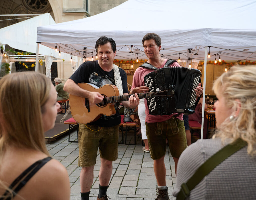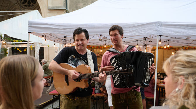 Bei Sonnenuntergang bietet der Turm der Marienkirche reizvolle Aussichten aufs 37. Reutlinger Weindorf – rechts die Wilhelmstraße, unterm Wasserspeier in Gelb das Dach des Weinbrunnens.