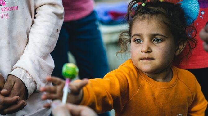Kleines Trostpflaster: Die Musketiere schenken einem kleinen Mädchen im Erdbebengebiet einen Lutscher. FOTO: MATTIA/MUSKETIERE