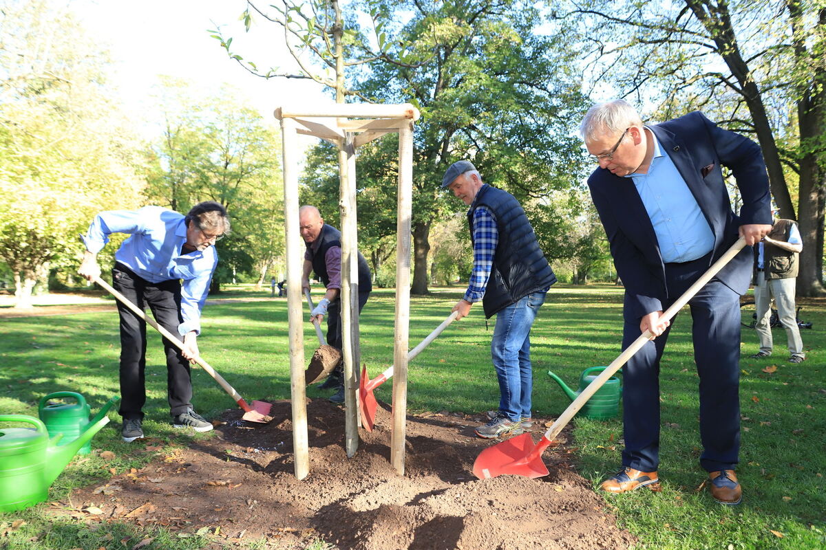 Eine neue Mispel für den Stadtgarten: Stadtrat Rüdiger Weckmann, Karl-Heinz Krauß, Reinhard Herbst-Ortmann (beide ILOS – Initiative für eine lebenswerte Oststadt) und OB Thomas Keck schwingen die Schaufel. FOTO: REISNER