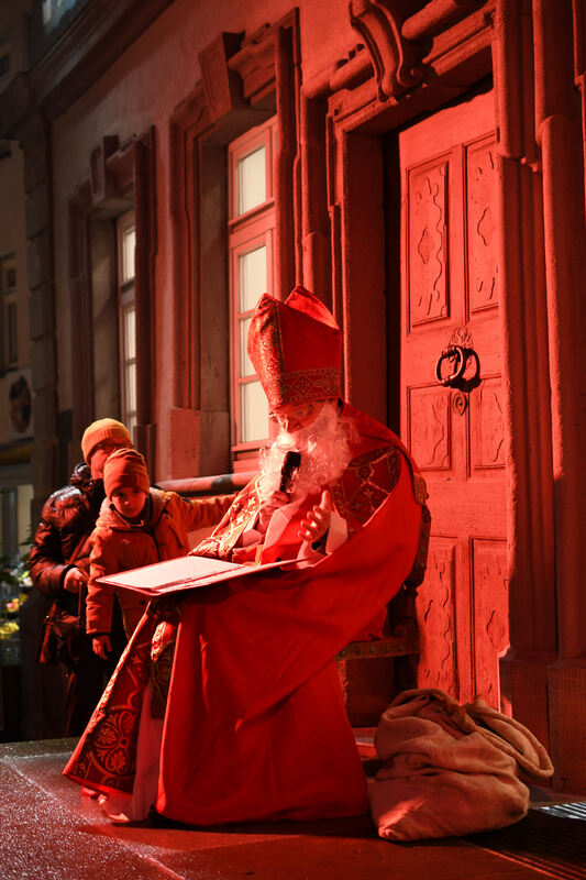 Der Nikolaus alias Harald Goebel verzaubert vor dem Reutlinger Naturkundemuseum die kleinsten Besucher des Weihnachtsmarktes.