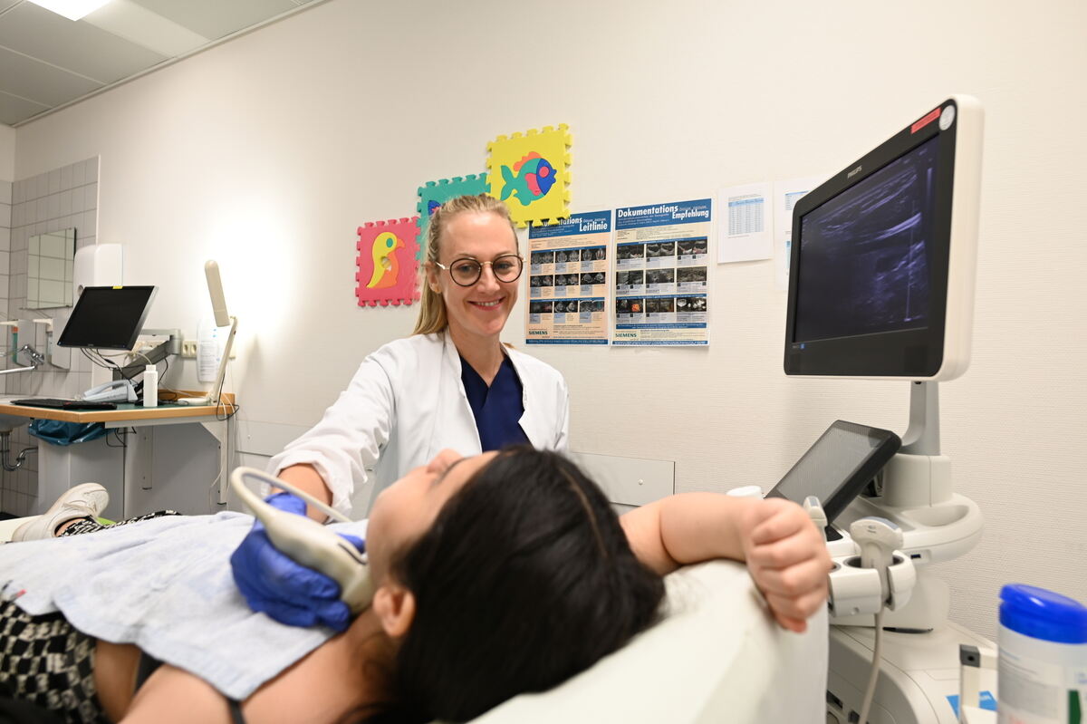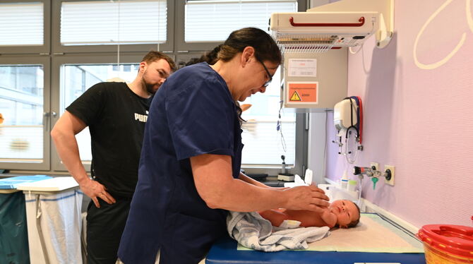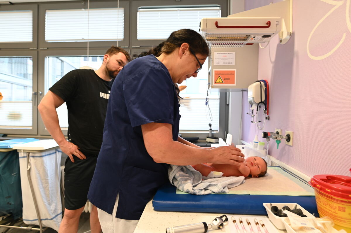 Mama und Papa sind glücklich, denn ihrem Sohn geht's formidabel: Oberärztin Birgit Jungk bei einer U2 Grunduntersuchung, die drei Tage nach der Geburt gemacht wird.