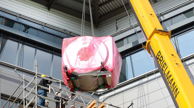 Es dauert eine Stunde, bis der vier Tonnen schwere Tomograf mit einem Lastenkran platziert ist. Ohne das neue Gerät würde das Krankenhaus Patienten verlieren.