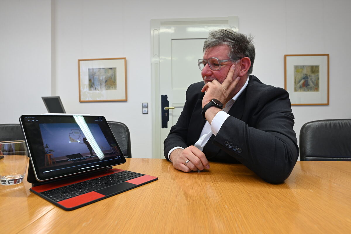 Der Reutlinger Landrat Dr. Ulrich Fiedler schaut gerne auf seinem Tablet jene Szene der Mitarbeiterversammlung an, auf der er allen das Du angeboten hat.