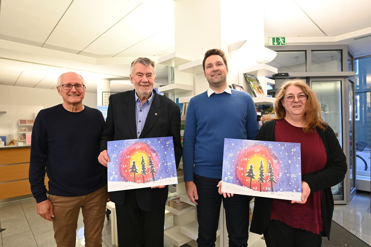 Was die drei Männer präsentieren, wird schon bald 1.600 mal Freude machen. So viele Kalender werden im GEA-Hof ganz zügig weg sein. Im vergangenen Jahr dauerte der freie Verkauf etwa eine Viertelstunde. Stolz zeigen Prof. Dr. Martin Lenz als derzeitiger Präsident des Lions-Clubs Reutlingen sowie der Activity-Beauftragte Jürgen Zeeb und Kalender-Organisator Frank Kretzschmar das Titelbild der 20. Auflage mit einem Rekordvolumen: 6.500 Exemplare werden gedruckt. Gestaltet hat den leuchtenden Titel der achtjährige Schüler Arda Sabir von der Friedrich-Hoffmann-Gemeinschaftsschule in Betzingen. Der Name des Bildes lautet »Tannenbäume im Schnee«.