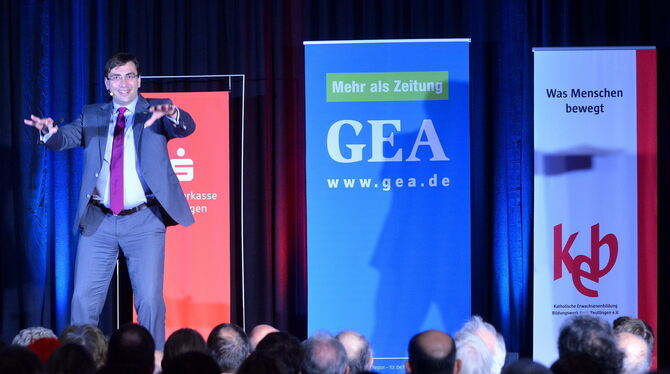 REUTLINGEN. Eloquent, kurzweilig, mit Headset und viel Gestik: Als Redner ist Sven Gábor Jánszkys eine Mischung aus Fernsehprediger und Hamburger Fischmarkt-Schreier. Auch Zuhörer, die keinen Gräten mögen, bleiben stehen und hören gebannt zu. Der Mann auf der Bühne der Reutlinger Kreissparkasse preist am Mittwochabend allerdings keine Makrelen an. Er bietet Prognosen feil. Und verkauft Zukunft als Verheißung.