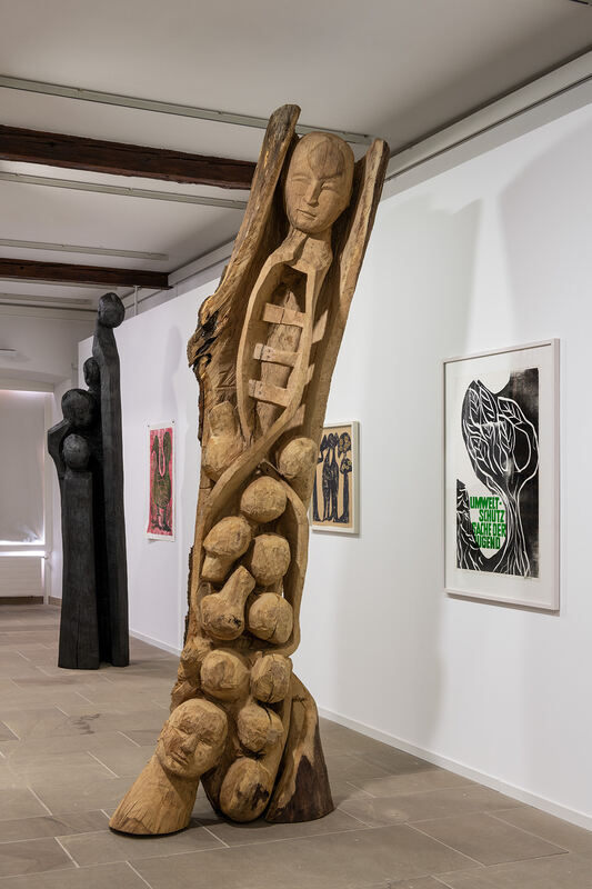 Anlässlich dieser ersten institutionellen Einzelausstellung in Europa widmet sich der Holzbildhauer Koko Bi auch dem Medium Holzschnitt. Was ihn mit dem deutschen Holzschneider HAP Grieshaber (1909–1981) verbindet, sind Themen, Werte und Materialität. Der Baum und seine Substanz stehen im Mittelpunkt der Ausstellung. Das Holz mit seinen charakteristischen Feinheiten wie Jahresringen, Astlöchern und individueller Farbigkeit wird in den Werken der beiden Künstler stets offenbar. In dem präzisen, fast zärtlichen Umgang kommt die hohe Wertschätzung zum Ausdruck, die beide für das Material ihrer Kunst zeigen. Beide Künstler thematisieren in ihren Werken das Schicksal des Waldes, welches untrennbar mit dem der Menschheit verbunden ist. Die politischen Holzschnitte Grieshabers sind Ausdruck vom Widerstand gegen den Raubbau an der Natur in den 1970er-Jahren und haben angesichts der Klimakrise nichts von ihrer Aktualität eingebüßt. Die Figurengruppen Koko Bis stehen in der Tradition einer solchen politischen Kunst, wobei seine Werke ein globales, ja universelles Plädoyer für einen nachhaltigen Umgang mit unseren Ressourcen vermitteln.