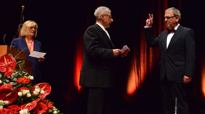 »So wahr mir Gott helfe«: Reutlingens neuer Oberbürgermeister Thomas Keck wird von Dr. Knut Hochleitner (Mitte) vereidigt. Erste Bürgermeisterin Ulrike Hotz hatte die feierliche Gemeinderatssitzung im Großen Saal der Stadthalle eröffnet. FOTOS: NIETHAMMER