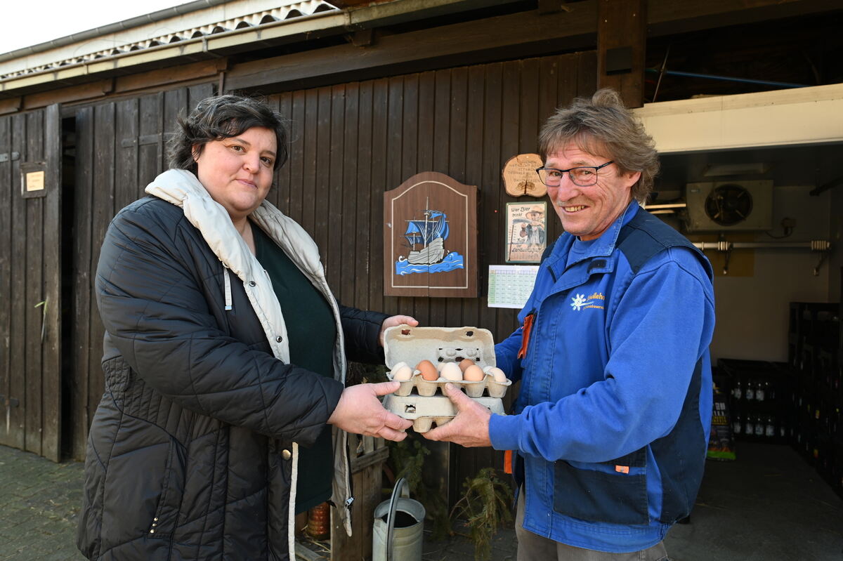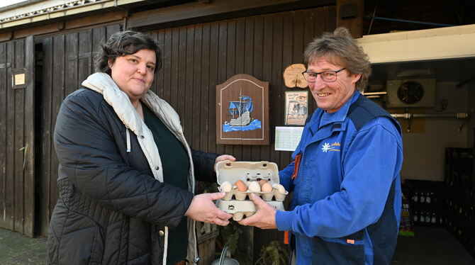 Dr. Katja Bader vom Naturkundemuseum holt die zukünftigen Osterküken bei Hansi Schwille auf seinem Erlebnisbauernhof. Ausgebrütet werden die Eier im Museum.